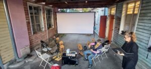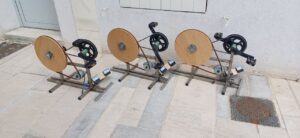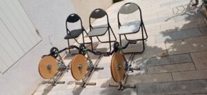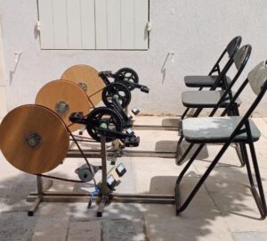 Tous ces pédaliers rassemblés génèrent plus d’ampérage que seul. Ici projo+son necessite la coordination d’au moins 4 personnnes mais avec les changements de place mieux vaut prévoir 6 . Les sieges réglables améliorent le confort d’usage. La combinaison de jambes ferait aussi fonctionner une pompe élec ou un mélangeur à chaux chanvre ? au milieux des champs ou d’une foret ? grosso modo compter qu’une personne moyenne génère env 50Wh. Les 100Wh/personne restent un mythe à notre humble avis.